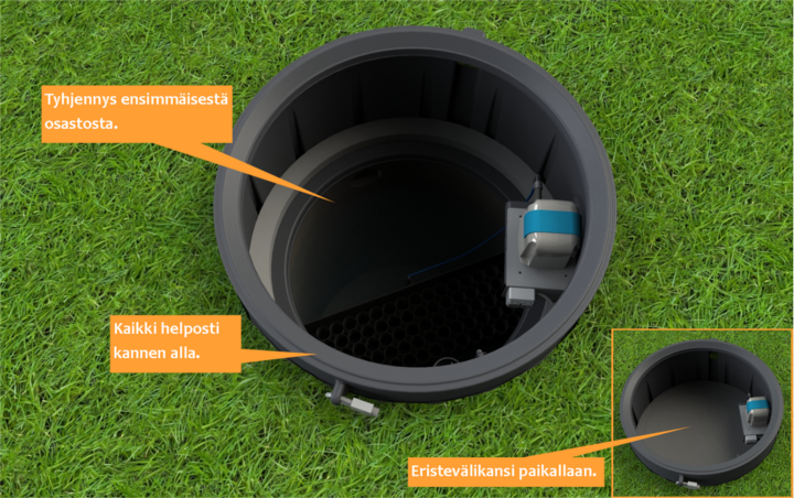 Säiliö asennetaan maan alle tarvittavaan syvyyteen. Sen jälkeen muovinen yläosa voidaan nostaa paikalleen. Näkyviin jää vain siisti kansi.